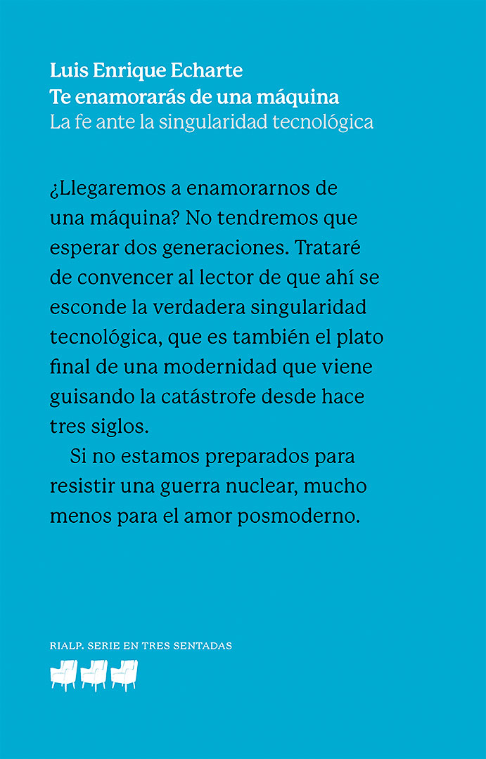 Este revelador ensayo de bioética analiza cómo los avances tecnológicos están afectando a los fundamentos de la cultura occidental. Echarte lanza una advertencia provocadora: enamorarse de una IA es “un peligro más letal y menos manifiesto que una explosión nuclear”. El autor invita a avanzar hacia un “verdadero humanismo tecnológico” y a “aprender de nuevo a temblar” ante los horizontes tecnológicos y el “amor máquina”, que identifica como el principal peligro de la posmodernidad.