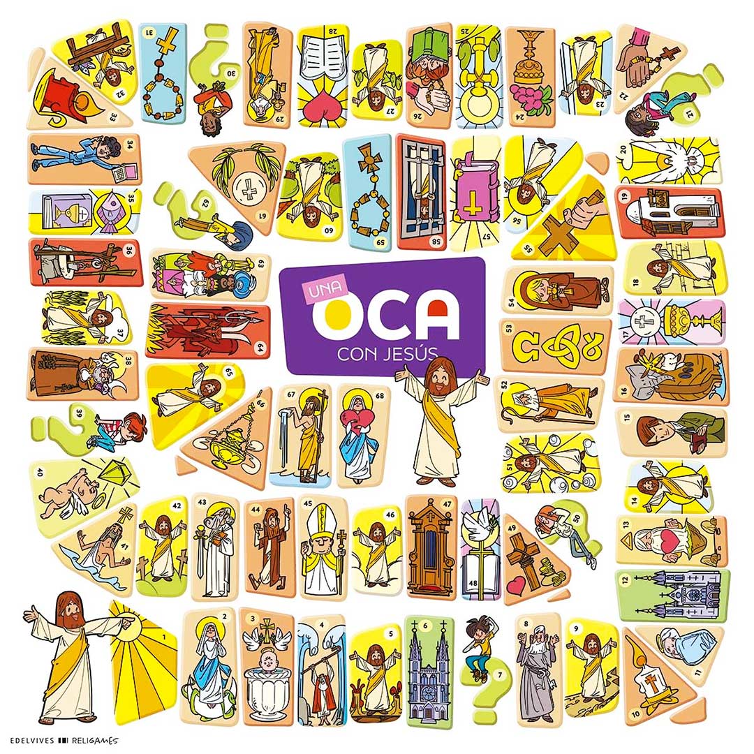 UNA OCA CON JESÚS es un juego educativo y cooperativo, inspirado en el clásico juego de la Oca, adaptado al contexto escolar y al currículum de Religión Católica.